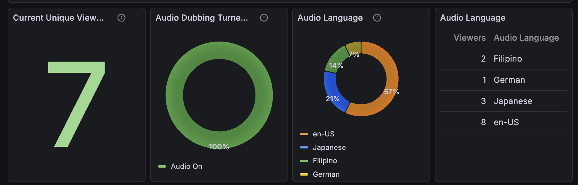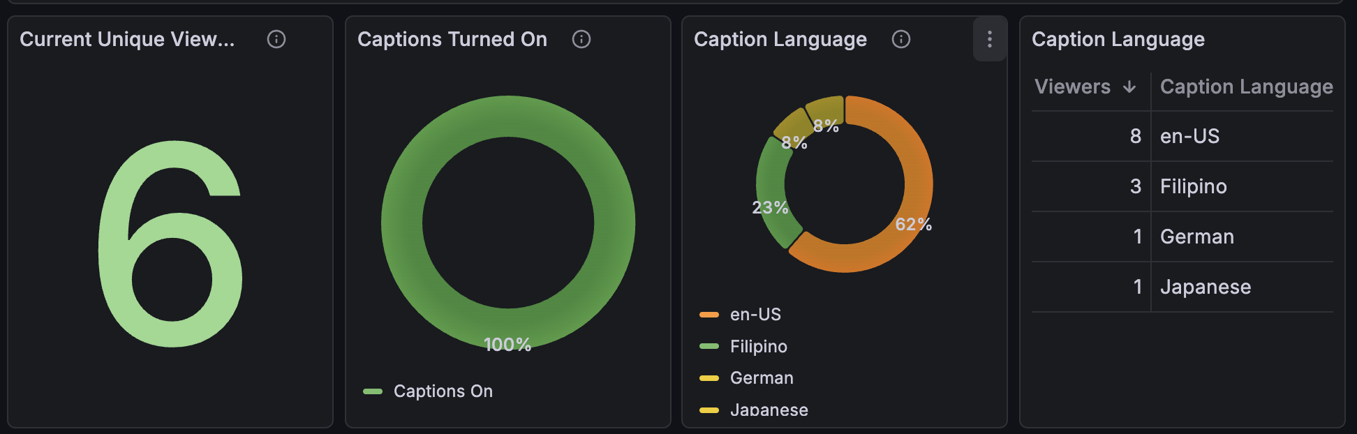 Every one of these metrics is available for both captions and audio dubbing giving you a unified, side by side view of how global audiences prefer to watch and listen to your streams.