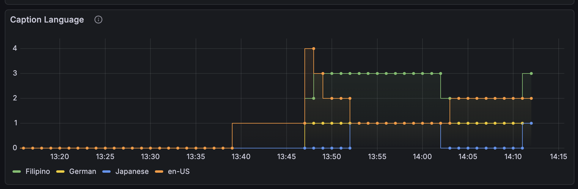 - Metrics over time: Track how caption and dubbing usage evolves through the video stream with clear real time timestream visualizations